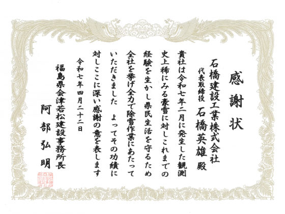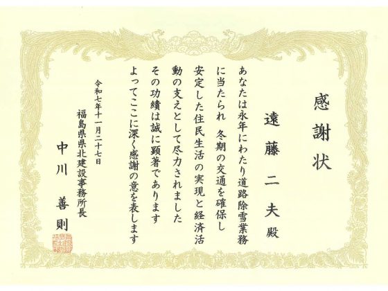 当社の社員が福島県県北建設事務所長より道路除雪業務の感謝状を贈呈されました