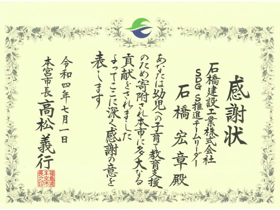 社会福祉法人本宮市社会福祉協議会より感謝状を贈呈されました