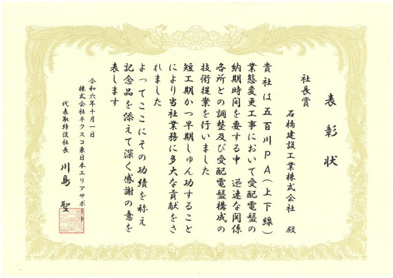 ネクスコ東日本より社長賞を受賞しました。 2024/10/01 2024年10月1日、五百川PA(上下線)業態変更時において、 関係各所との調整及び受配電盤構成の技術提案を行ったことから、 NEXCO東日本より社長賞を受賞しました。 « 前の記事 次の記事 »