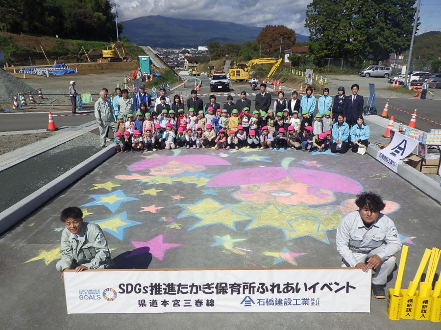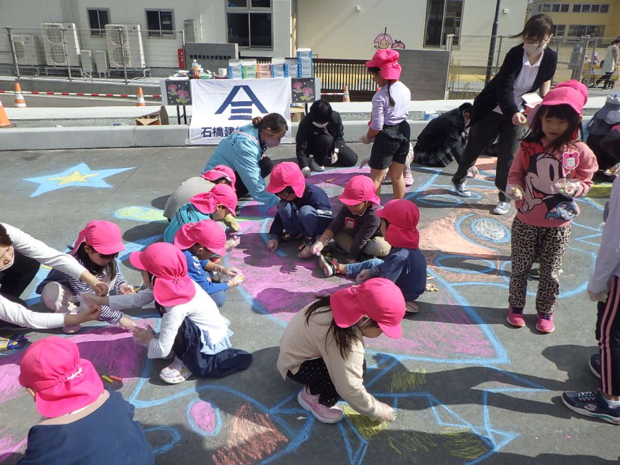 たかぎ保育所の皆さんとは、工事完成前の道路に地域にゆかりの絵をチョークで描くイベントを行い、建設工事への理解を深めていただきました。 2023年10月16日
