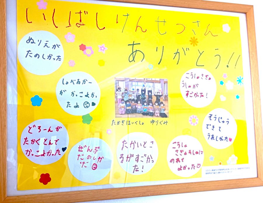後日、たかぎ保育所のゆり組さんたちが描いた寄せ書きを、会社に届けていただきました。
